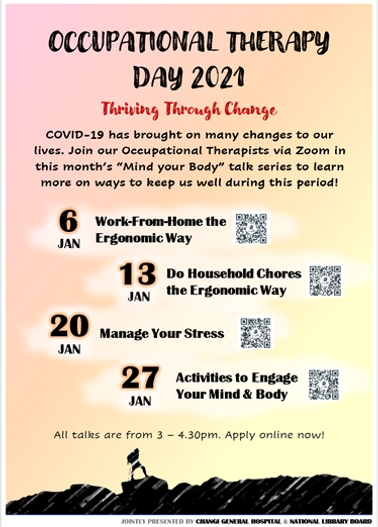 The COVID-19 outbreak has negatively affected the physical and mental well-being of Singaporeans amidst the uncertainty that this pandemic brings. We recognize the importance of addressing such issues and enhancing occupational participation of individuals. Hence we intend to use this opportunity to share our knowledge on ways to improve the physical and mental well-being of the public, while increasing awareness of the various roles and skills of an Occupational Therapist.